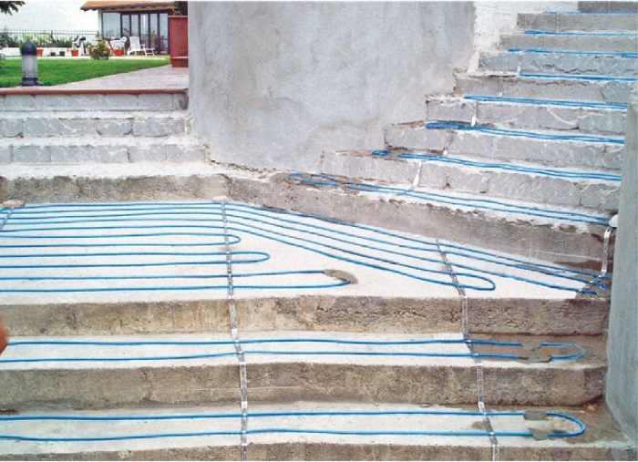 Ввиду того, что боковые части ступеней не обогреваются, крайние витки кабеля надо располагать как можно ближе к краю ступени. Если отлитые ступени нуждаются в выравнивании, как на фото, то кабель укладывают поверху ступеней, закрепляют при помощи монтажной ленты и заливают выравнивающим раствором. Для это лучше использовать сухие смеси на цементной основе, предназначенные для выравнивания поверхностей.