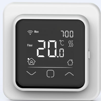 Оснащен двумя датчиками температуры. Один датчик для замера температуры пола, второй для замера температуры воздуха (встроен в терморегулятор).