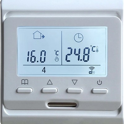 Оснащен двумя датчиками температуры. Один датчик для замера температуры пола, второй для замера температуры воздуха (встроен в терморегулятор).