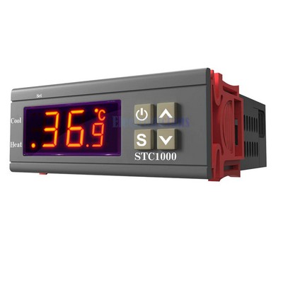 Краткая инструкция по эксплуатации терморегулятора STC-1000: Дисплей отображает два режима работы: нагрев и охлаждение. Четыре кнопки управления: включение/выключение, вход в режим программирования (S) и две стрелки вверх и вниз. Включение и выключение производится путем удерживания кнопки питания не менее 3 секунд. После первого включения термостат показывает температуру среды в которой находиться датчик. Для просмотра температуры, на поддержание которой запрограммирован контроллер надо нажать «вверх» (Может задаваться в диапазоне от -50 до 99,9 градуса с точностью до одной десятой. По умолчанию 10,0 С). Нажатие стрелки «вниз» выводит гистерезис на который настроен контроллер (Может задаваться от 0,3 до 10 градусов с точностью до десятых. В заводских настройках 0,5 градуса). Для входа в режим программирования нажимаем и удерживаем кнопку S не менее 3 секунд, на дисплее появится F1. Далее кнопками вверх-вниз выбираем нужную функцию: F1 -температура сробатывания, F2 -гистерезис (разница между температурой включения и выключения), F3 — задержка сробатывания в минуттах, F4 — коррекция температуры. Кратковременно нажимаем кнопку S. На дисплее отобразится заданный параметр. Нажимаем кнопку S и не отпуская ее стрелками «вверх» или «вниз» задаём требуемуемый параметр. Для выхода из режима программирования с сохранением настроек кратковременно нажимаем кнопку включения/выключения. Если надо выйти не сохраняя настройки, то контроллер сам выйдет в рабочий режим, если не нажимать кнопки в течение 30 секунд. Если на дисплее отобразилось Er (ошибка), то, нажимаете любую кнопку и держите до перезагрузки контроллера. После этого все настройки сбросятся на заводские.