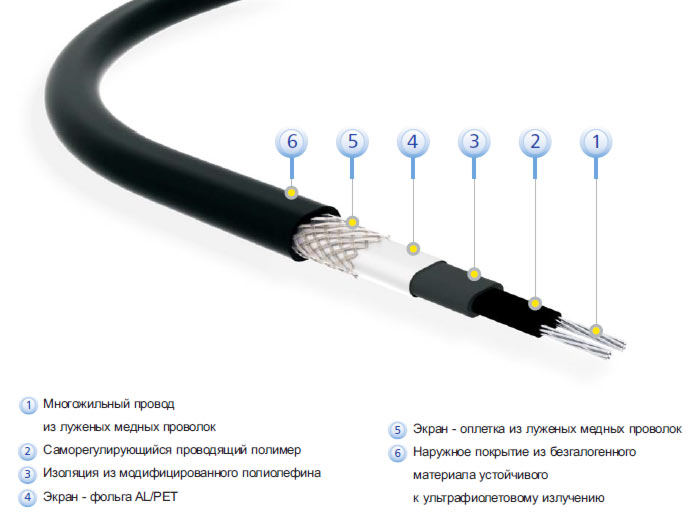 Основное преимущество саморегулирующихся кабелей – кабель нагревается там, где нужно, высокая противопожарная безопасность.