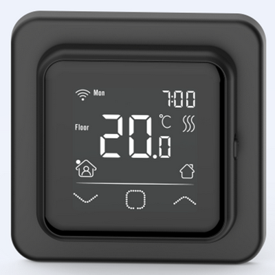Оснащен двумя датчиками температуры. Один датчик для замера температуры пола, второй для замера температуры воздуха (встроен в терморегулятор).